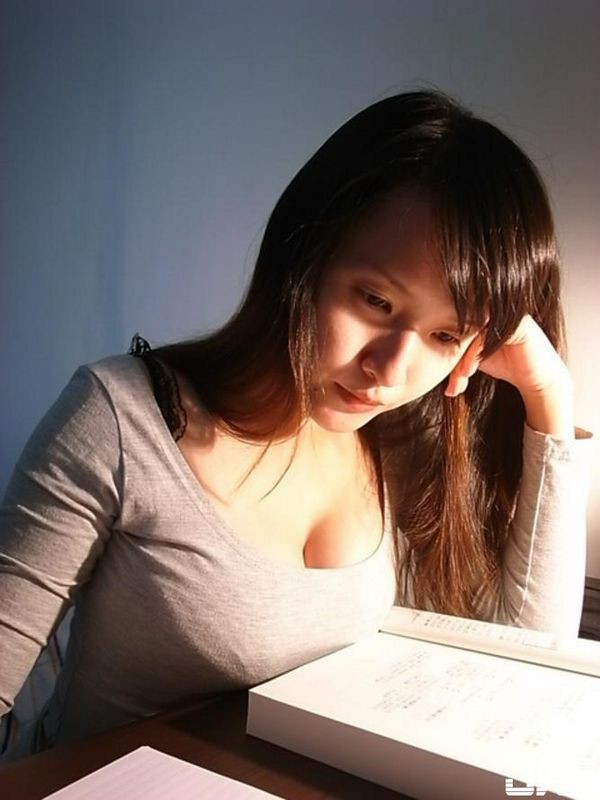 正妹大绿看书看到肩膀好酸把重量级奶球放在桌上休息
